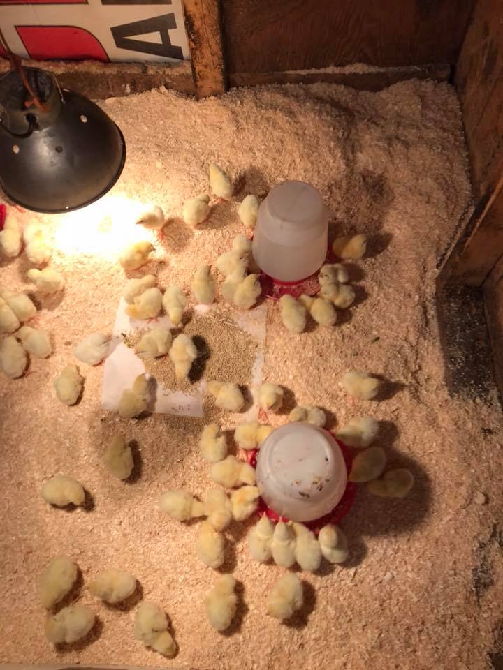 We raise the chicks in the shelter of our barn until they have feathers, around four weeks old. Then they move to our movable pasture pens, that are pulled to fresh grass each morning for a constant supply of clean greens.
